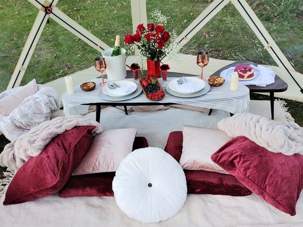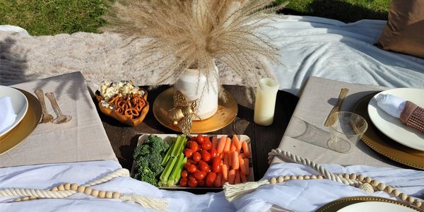 Experience the Romantic Table for Two, where a beautifully adorned table awaits you. With fine linens, exquisite tableware, and delightful décor, every detail is carefully curated to create a captivating ambiance. Sink into the soft, comfortable cushions, allowing you and your partner to relax in cozy comfort. This intimate setting becomes the stage for cherished conversations, shared laughter, and creating memories that will make your picnic truly unforgettable.