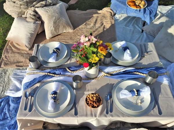 An ornate table, adorned with fine linens and shimmering tableware, takes center stage, inviting you and your companions to take a seat on plush cushions. Immerse yourself in the joyful camaraderie of the splendid soiree, where laughter and conversation mingle harmoniously with the enchanting atmosphere. Whether it's celebrating a special occasion or simply relishing the company of loved ones, this luxury picnic experience promises an unforgettable journey into elegance and bliss.