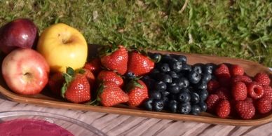 Delight in a bountiful seasonal fruit tray, brimming with an assortment of fresh and succulent fruits, offering a vibrant and invigorating taste experience for you and your group.